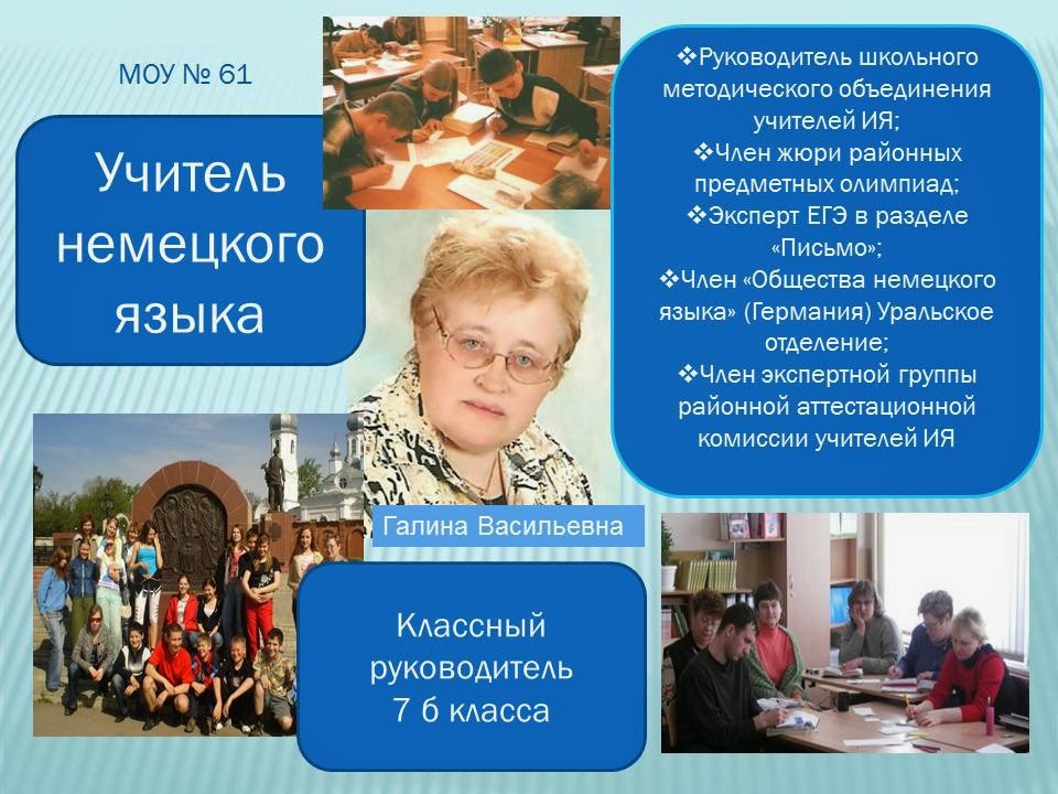 Первый раздел странички мы посвящаем прекрасному педагогу, учителю немецкого языка высшей квалификационной категории, классному руководителю ГАЛИНЕ ВАСИЛЬЕВНЕ УРАНОВОЙ и передаем ей слова благодарности и любви всех ее выпускников.